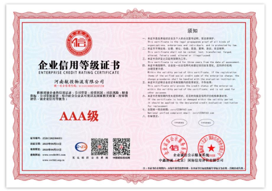 近日,航投物流通過GB/T 19001-2016/ISO 9001:2015質量管理體系認證審核,榮獲ISO質量管理體系認證證書,同時獲得了企業(yè)信用的最高評定——AAA級企業(yè)信用等級證書,被授予“十證一牌”。喜獲雙重肯定,意味著航投物流在行業(yè)綜合競爭中邁上新臺階,是對其高效業(yè)務流程、標準化經(jīng)營、規(guī)范化管理模式的肯定。